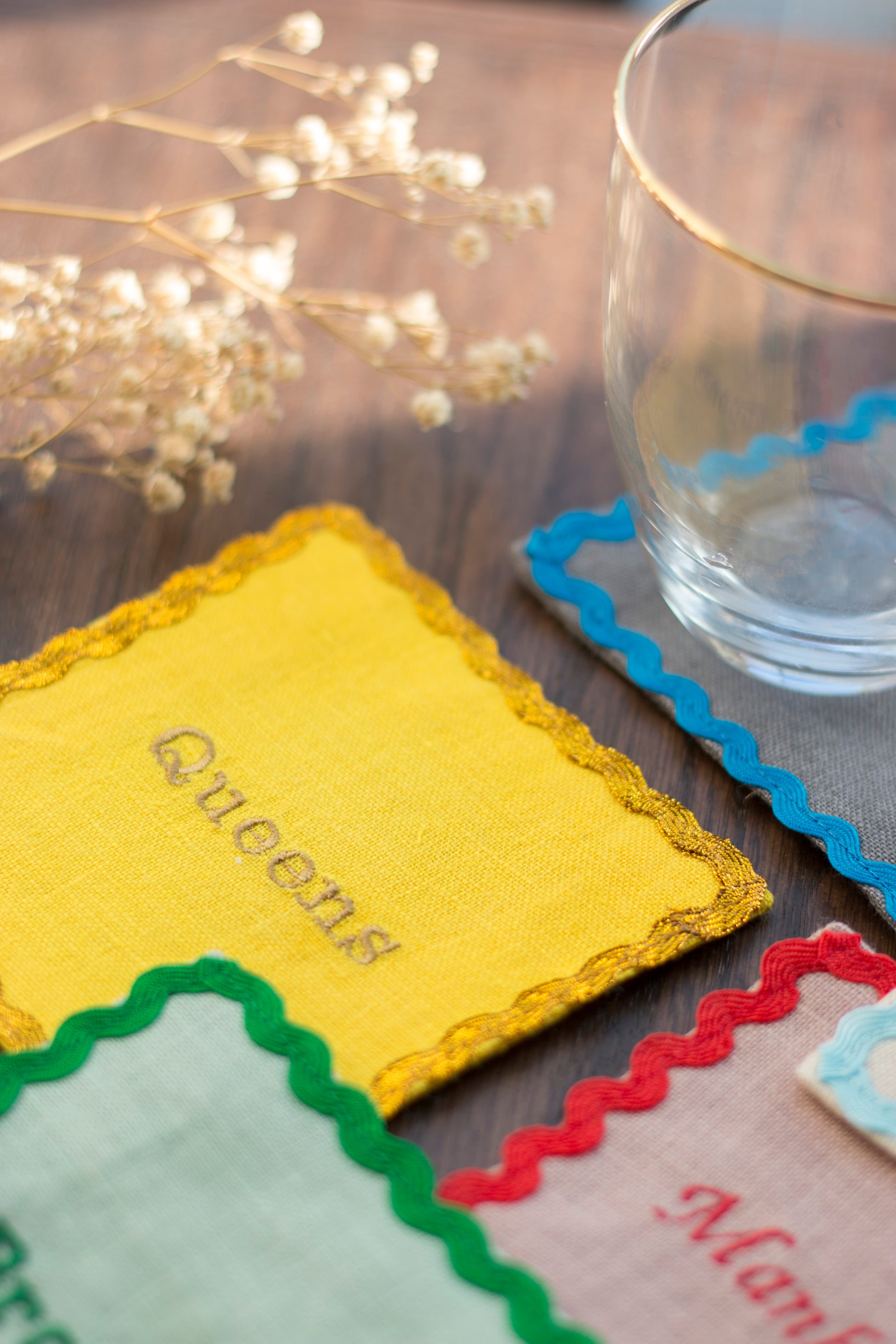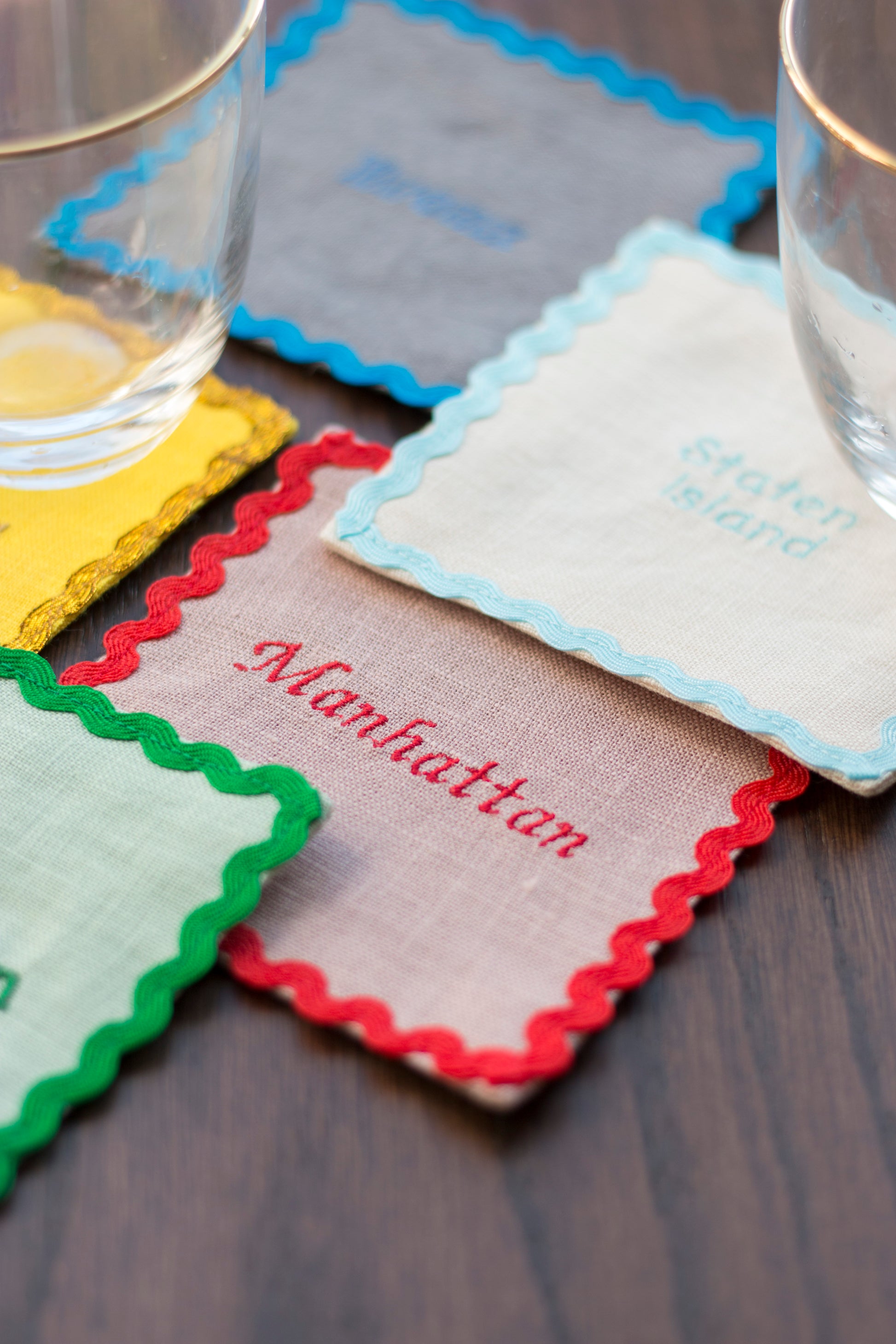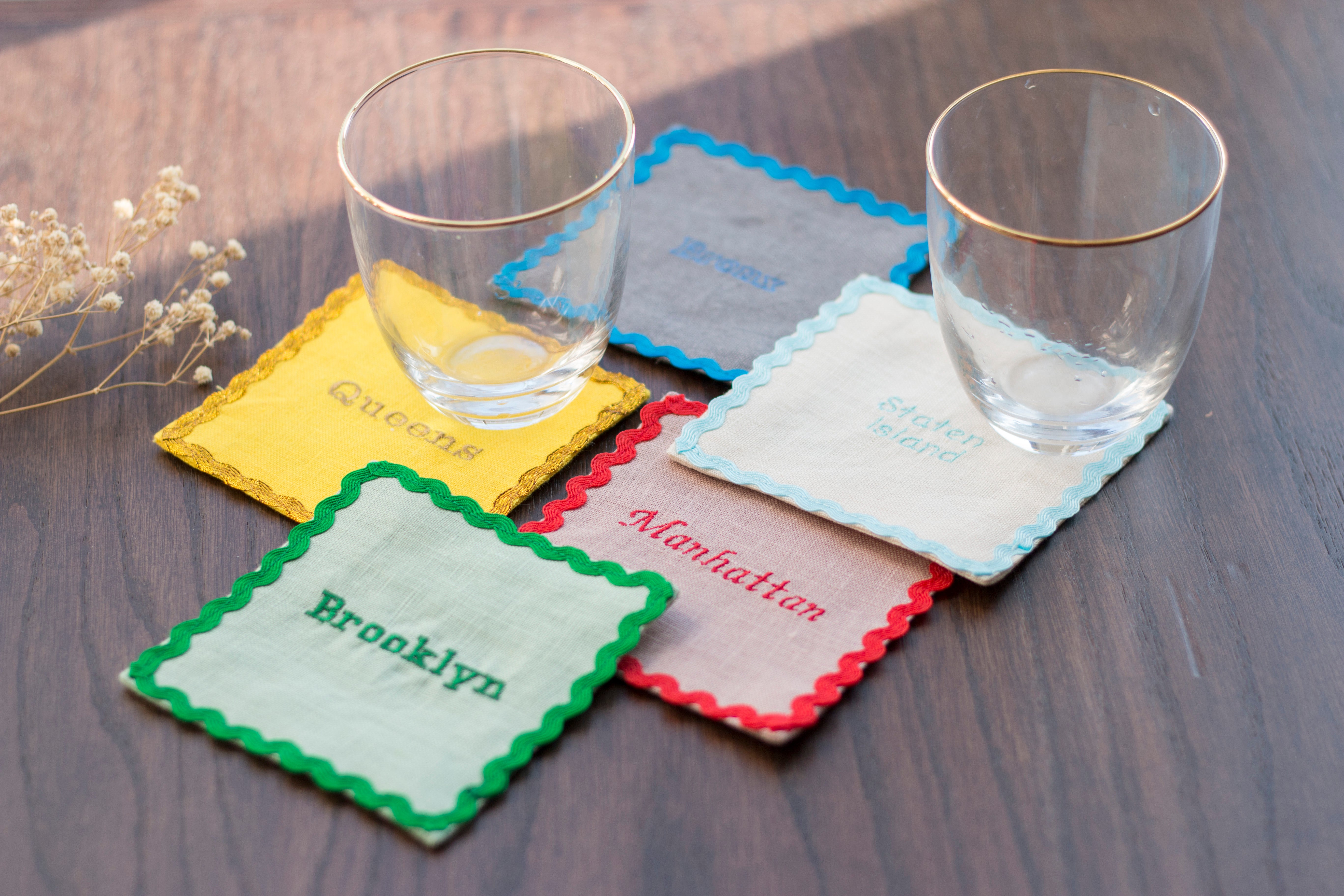 Add New York City charm to your home with this linen coaster set, featuring embroidered names of iconic NYC boroughs: